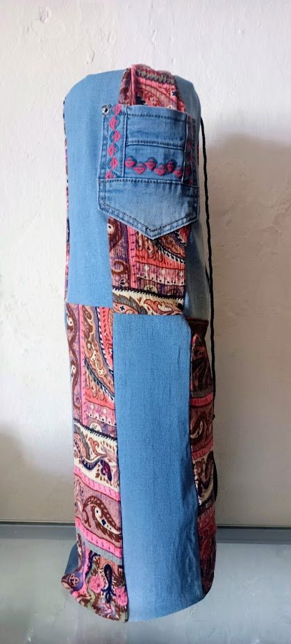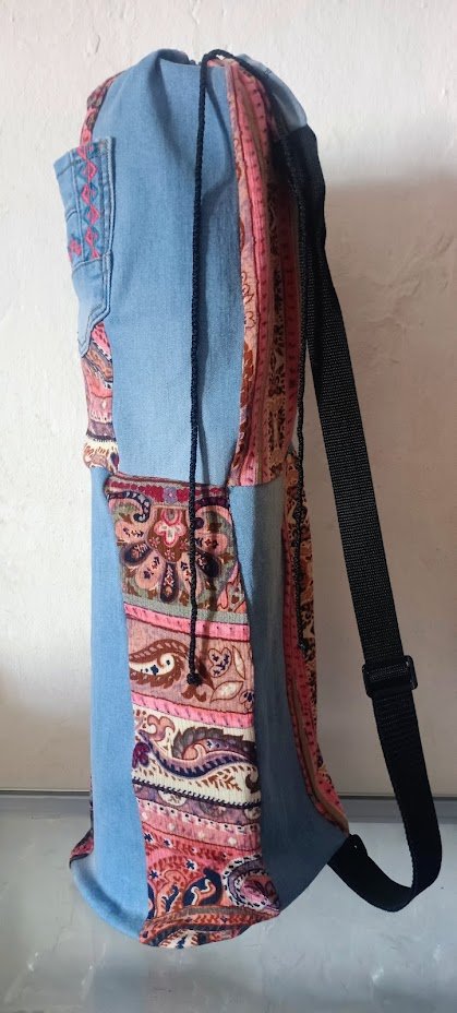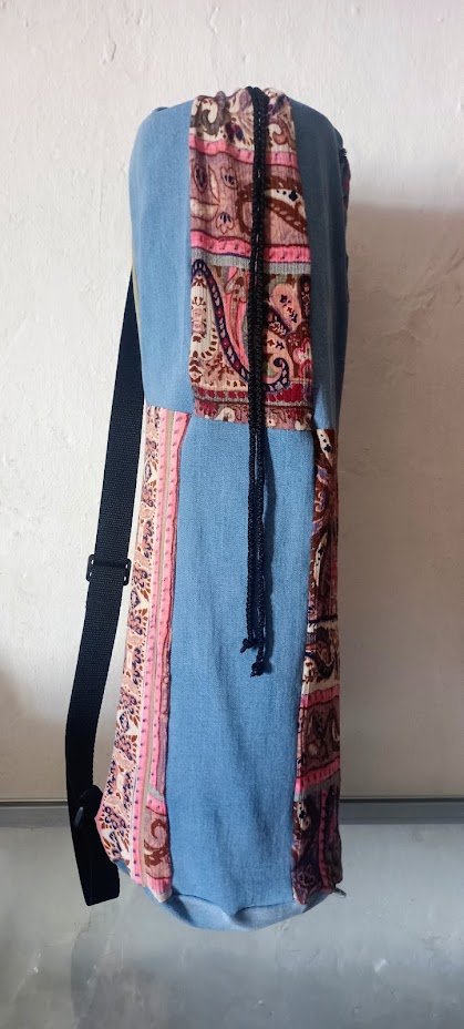 Transporta tu mat de yoga con conciencia y estilo gracias a este portamat artesanal sustentable, confeccionado a partir de telas recicladas de jeans y otros textiles, dando una segunda vida a materiales y reduciendo el impacto ambiental.